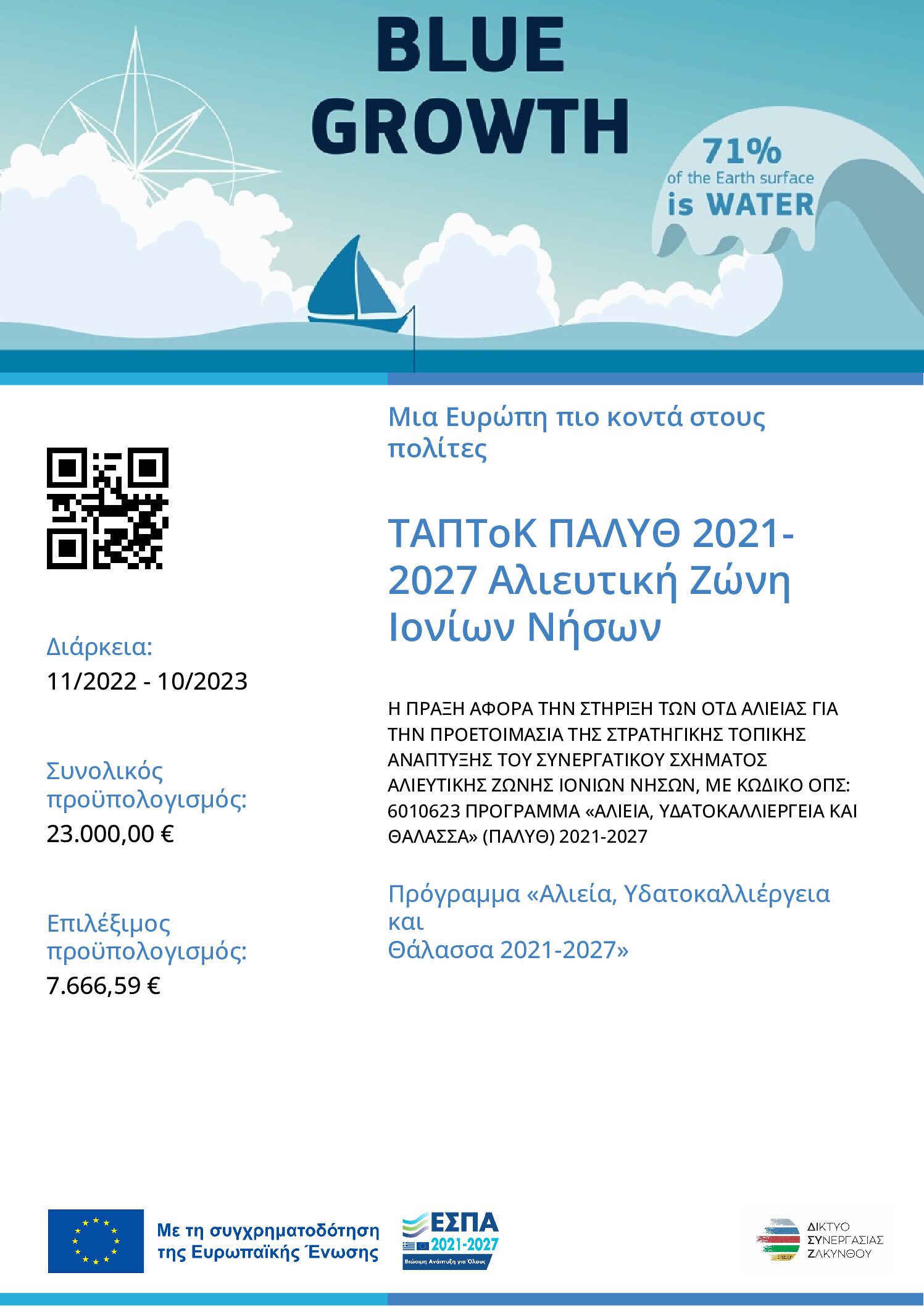 Η πράξη αφορά προετοιμασία και υποβολή Στρατηγικής Τοπικής Ανάπτυξης (Φάκελοι Α και Β) για την αλιευτική ζώνη Ιονίων Νήσων, στο πλαίσιο της υπ΄ αριθ. 1791/07.09.2023 (Β’5462) πρόσκλησης για την Προτεραιότητα 3 του ΠΑΛΥΘ 2021 – 2027. Δημιουργία τοπικής αναπτυξιακής στρατηγικής για την αλιευτική ζώνη Ιονίων Νήσων, και υποβολή στη διαχειριστική αρχή του ΠΑΛΥΘ 2021-2027, στο πλαίσιο της υπ’ αριθ. 1791/07.09.2023 (Β’ 5462) πρόσκλησης, των Φακέλων Α και Β.